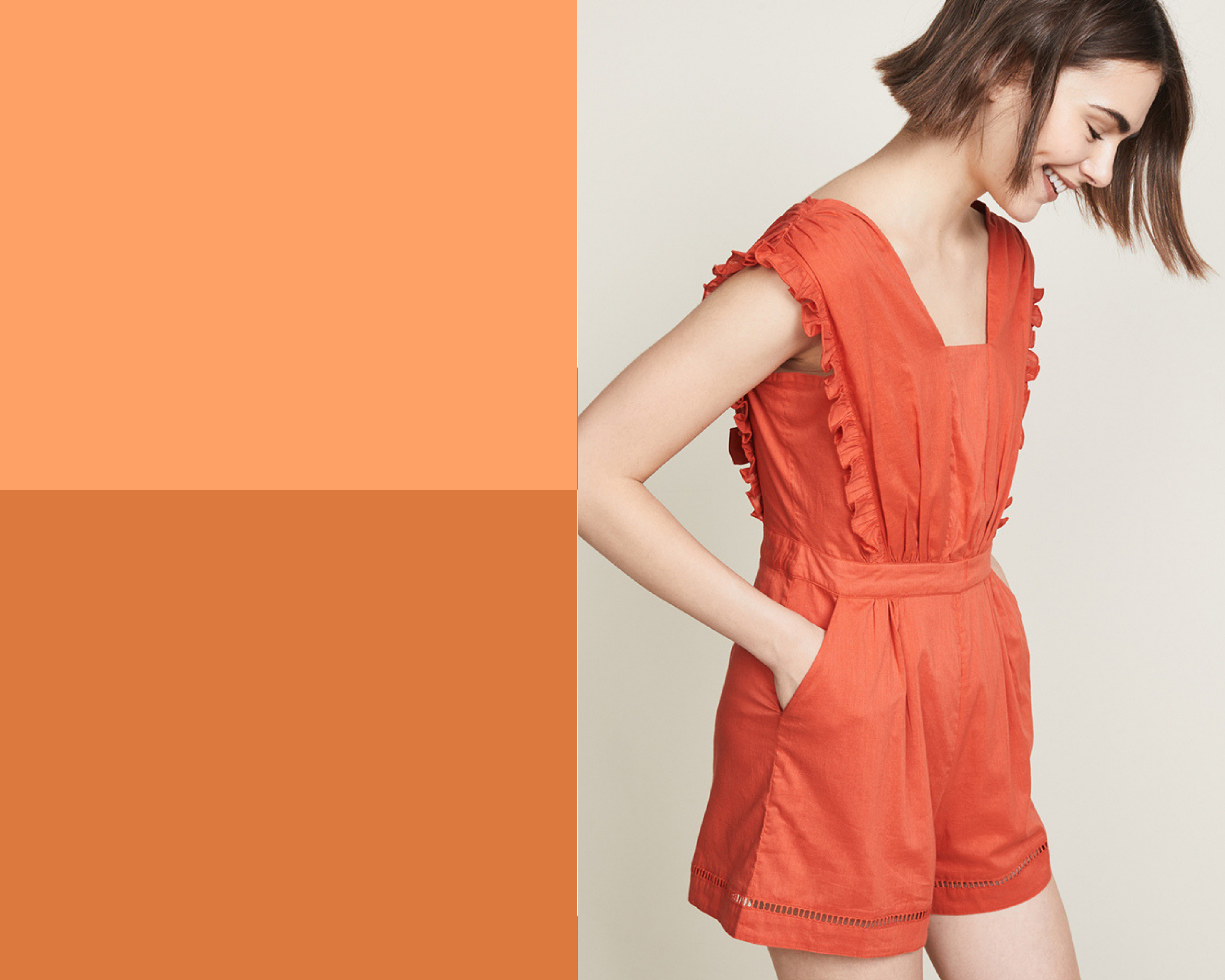 But first let’s talk more about living coral: it is a cheerful color, with golden shades that provides energy and dynamism. It is very flattering for warm people. In which case they should use it close to the face and in makeup. Meanwhile, for those whose colorimetry tends to be cold, it is advisable to use it on bottoms, shoes or accessories away from the face.